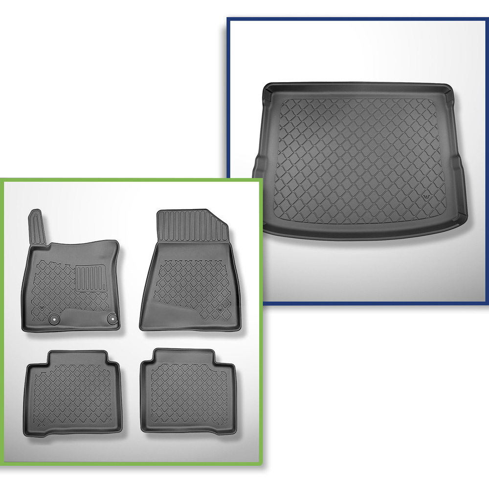 Set Kofferraumschale und angepasste Autoteppiche TPE für: Kia Niro II (SG2) Crossover (06.2022-....) - HEV Hybrid;EV (electric);oberer Kofferraum (für Multiboden);beweglicher Boden in höchster Stellung;nicht fuer Plug-in Hybrid