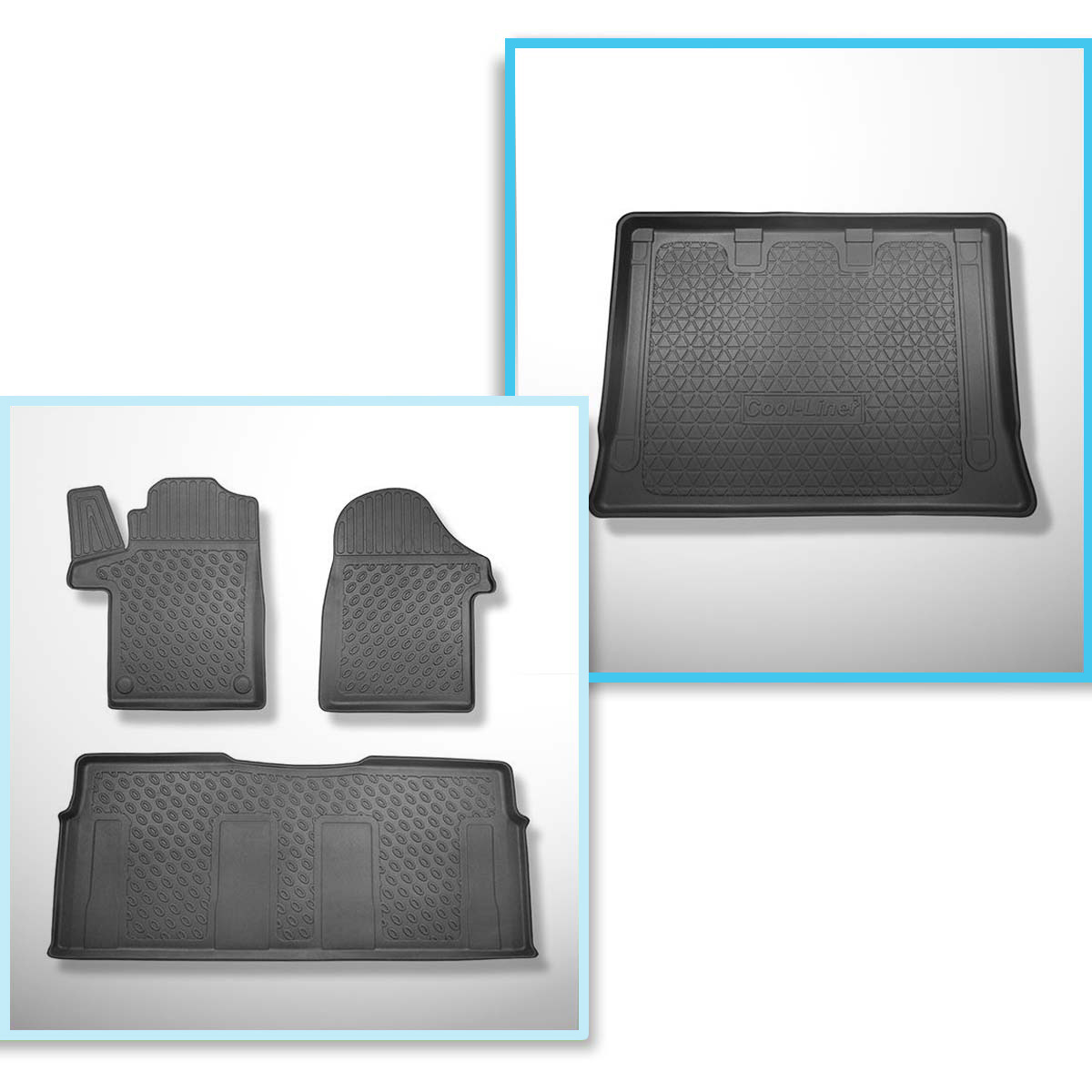 Set Kofferraumschale und angepasste Autoteppiche TPE PREMIUM für: Mercedes-Benz Vito W447 Tourer (10.2014-....) - Extra lange Version (Extra Long) (Radstand 3430 mm;Fahrzeuglänge 5370 mm);ohne geteilten Gepäckraum;ohne 3. Sitzreihe