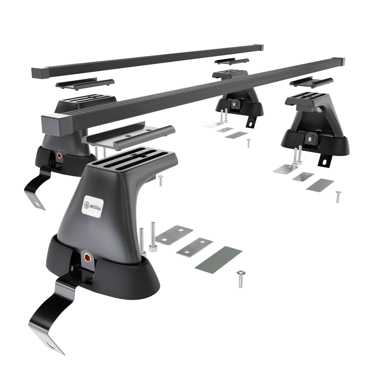 - 4 Fußsätze (Halter) – für standardmäßige Dächer ohne werkseitige Fixpunkte – Montage am Dachrand, Tragfähigkeit 75 kg (oder gem. Empfehlungen des Fahrzeugherstellers).