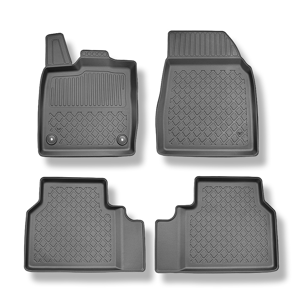 - Die Teppiche haben moderne Muster und mattes Finish. Jedes Set ist für das jeweilige Modell und Generation des Fahrzeugs bestimmt, was 100% Anpassung an den Fußboden des Autos garantiert. Im Set befinden sich auch Befestigungsclips, falls sie im jeweiligen Fahrzeugmodell vorgesehen sind.