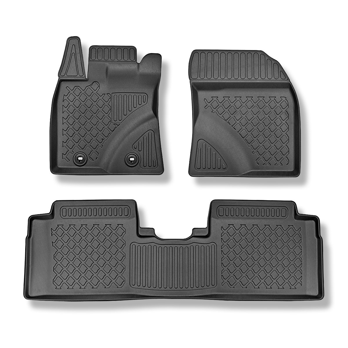 - Die Teppiche haben moderne Muster und mattes Finish. Jedes Set ist für das jeweilige Modell und Generation des Fahrzeugs bestimmt, was 100% Anpassung an den Fußboden des Autos garantiert. Im Set befinden sich auch Befestigungsclips, falls sie im jeweiligen Fahrzeugmodell vorgesehen sind.
