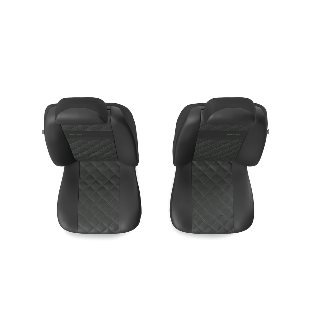 - Die Sitzbezüge bestehen aus strapazierfähigem, schmutzabweisendem schwarzem Kunstleder mit dekorativer Steppung in Grün in der Mitte. Die Vorderseiten der Bezüge sind zusätzlich bestickt.