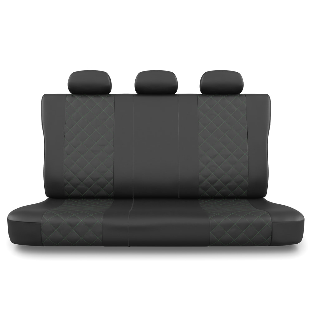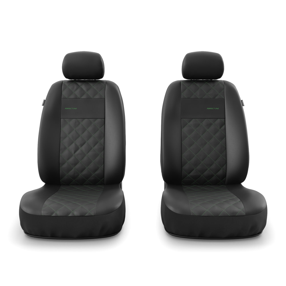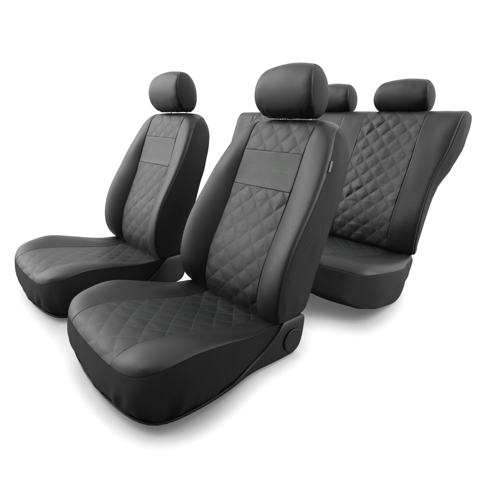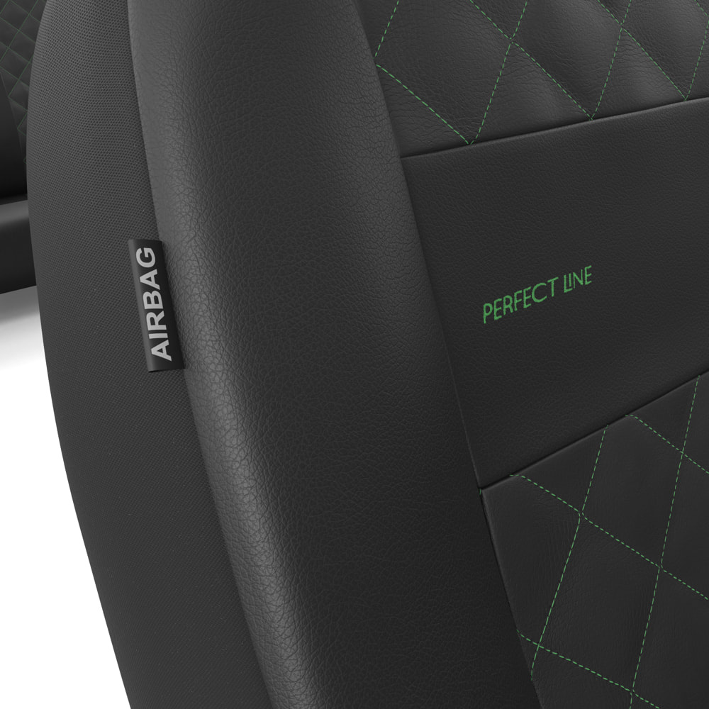 - Die Sitzbezüge bestehen aus strapazierfähigem, schmutzabweisendem schwarzem Kunstleder mit dekorativer Steppung in Grün in der Mitte. Die Vorderseiten der Bezüge sind zusätzlich bestickt.