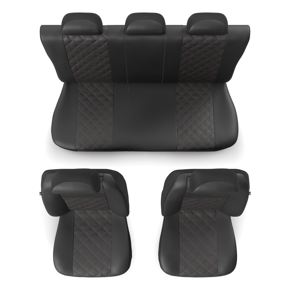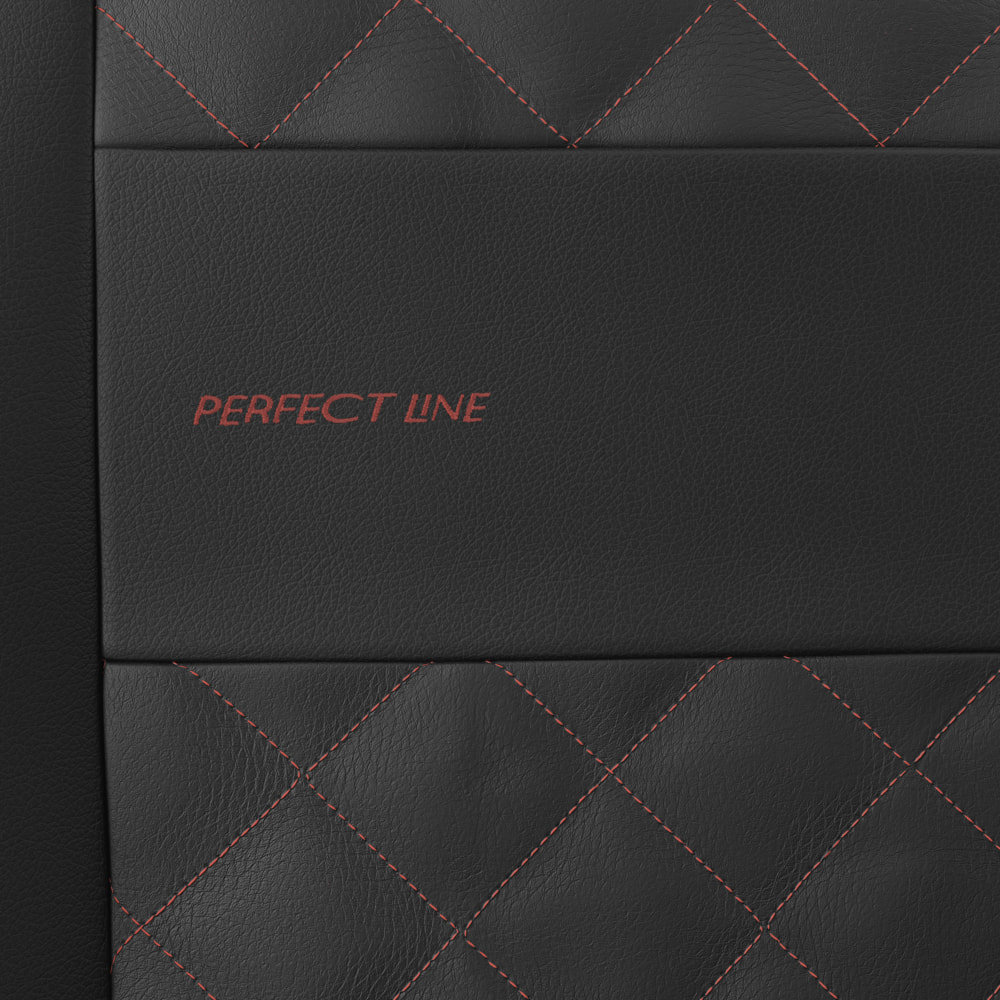 - Die Sitzbezüge bestehen aus strapazierfähigem, schmutzabweisendem schwarzem Kunstleder mit dekorativer Steppung in Rot in der Mitte. Die Vorderseiten der Bezüge sind zusätzlich bestickt.