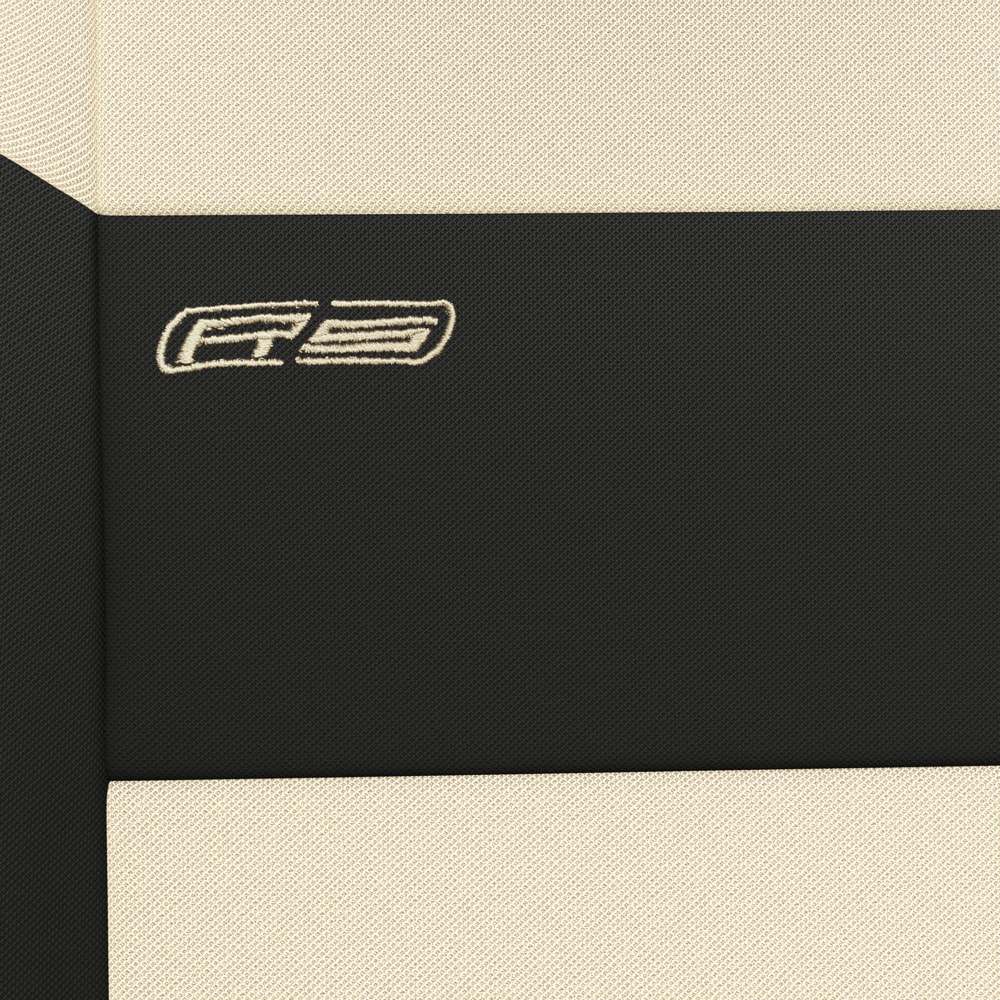 - Die Bezüge bestehen aus schwarzem Polsterstoff mit einem Mittelteil aus Beige-Stoff. Auch auf der Vorderseite sind sie mit einer sportlichen Stickerei versehen.