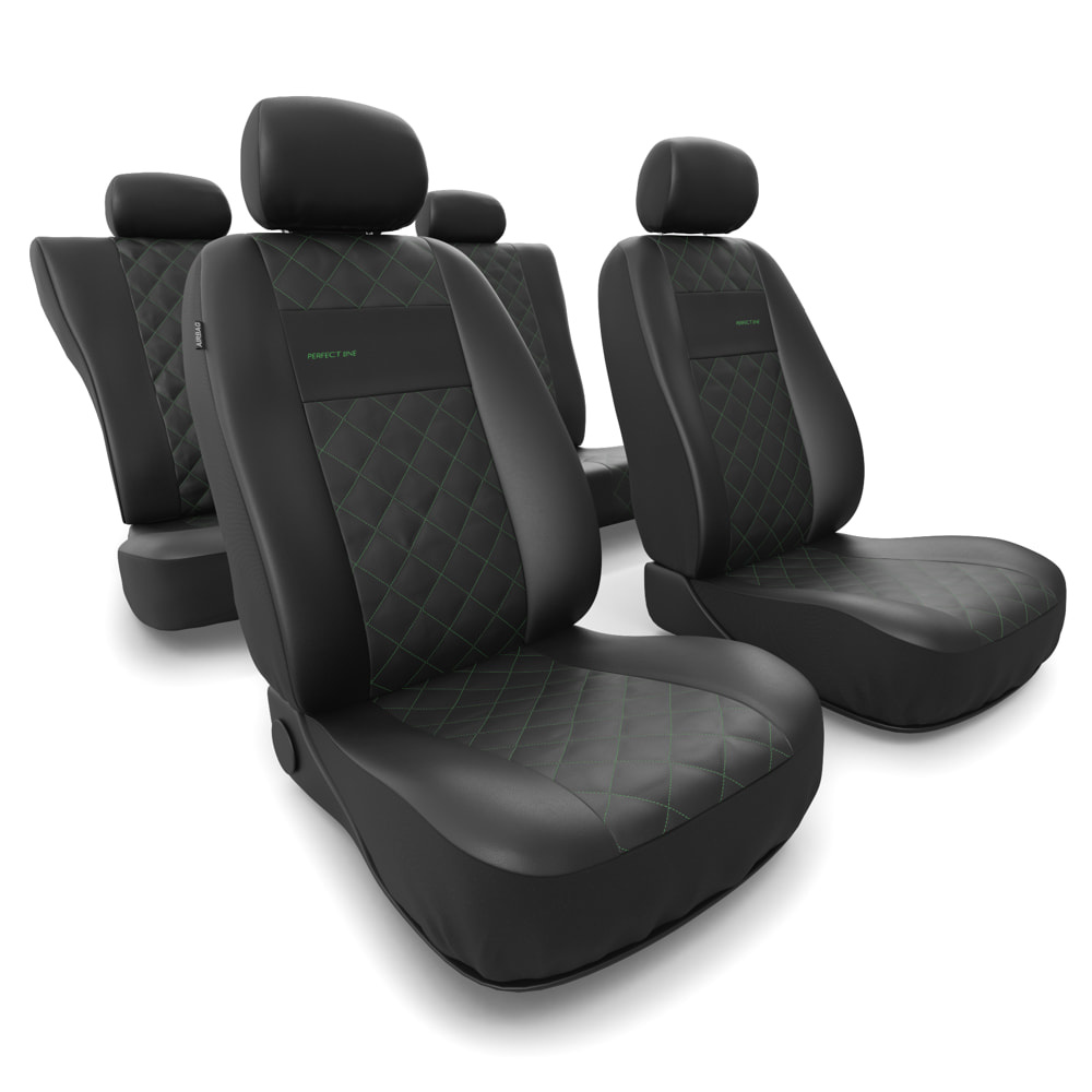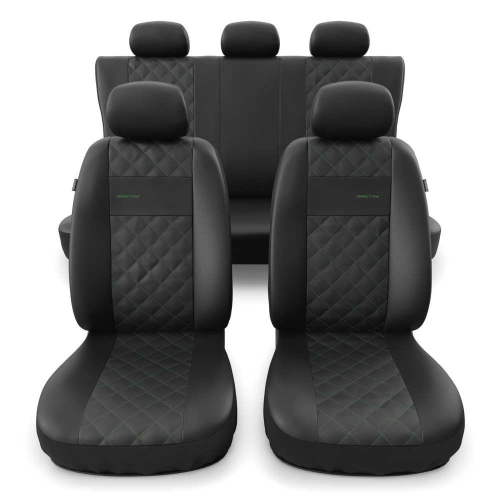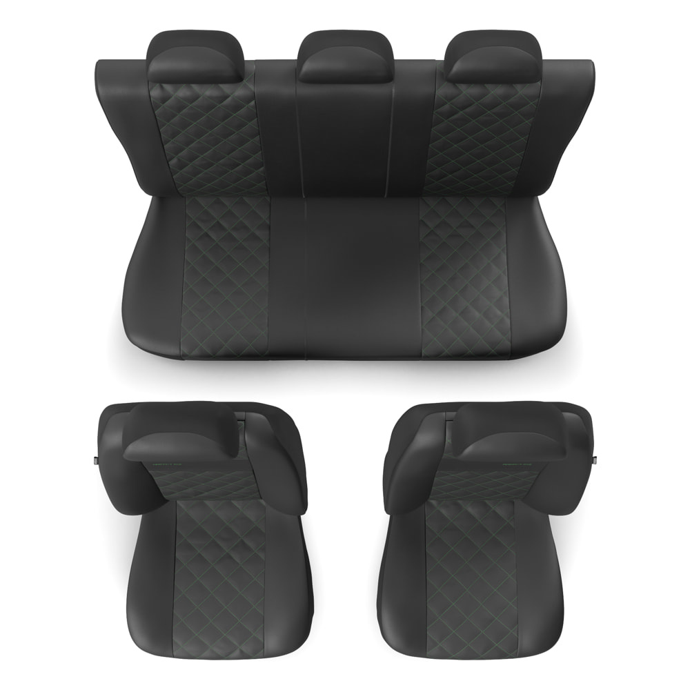 - Die Sitzbezüge bestehen aus strapazierfähigem, schmutzabweisendem schwarzem Kunstleder mit dekorativer Steppung in Grün in der Mitte. Die Vorderseiten der Bezüge sind zusätzlich bestickt.