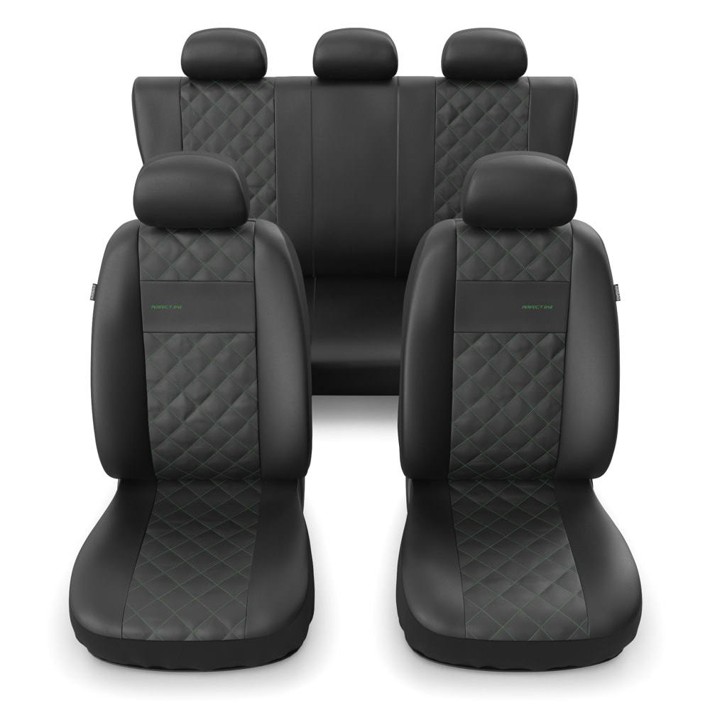 - Die Sitzbezüge bestehen aus strapazierfähigem, schmutzabweisendem schwarzem Kunstleder mit dekorativer Steppung in Grün in der Mitte. Die Vorderseiten der Bezüge sind zusätzlich bestickt.