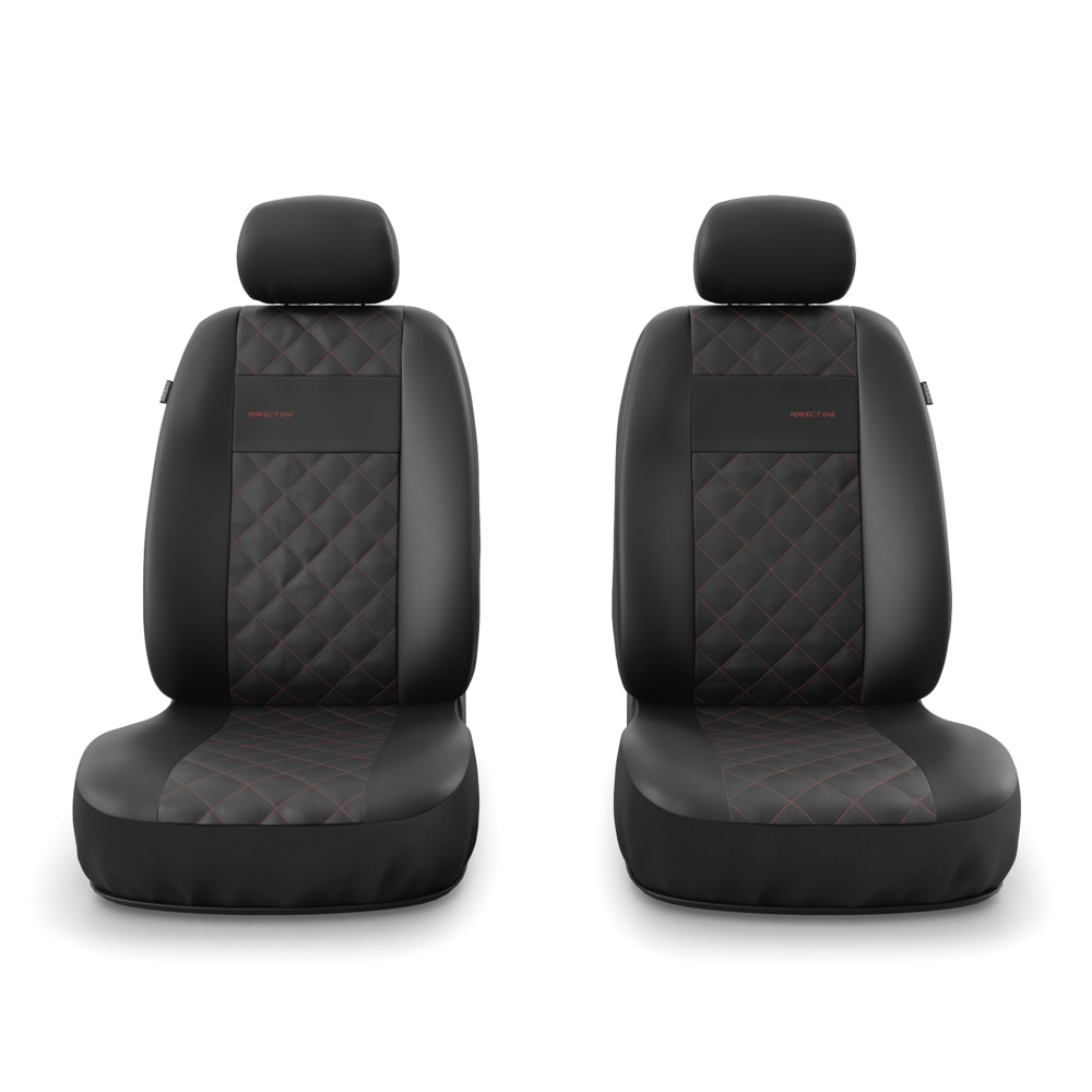 - Die Sitzbezüge bestehen aus strapazierfähigem, schmutzabweisendem schwarzem Kunstleder mit dekorativer Steppung in Rot in der Mitte. Die Vorderseiten der Bezüge sind zusätzlich bestickt.