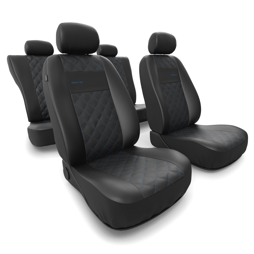 - Die Sitzbezüge bestehen aus strapazierfähigem, schmutzabweisendem schwarzem Kunstleder mit dekorativer Steppung in Blau in der Mitte. Die Vorderseiten der Bezüge sind zusätzlich bestickt.